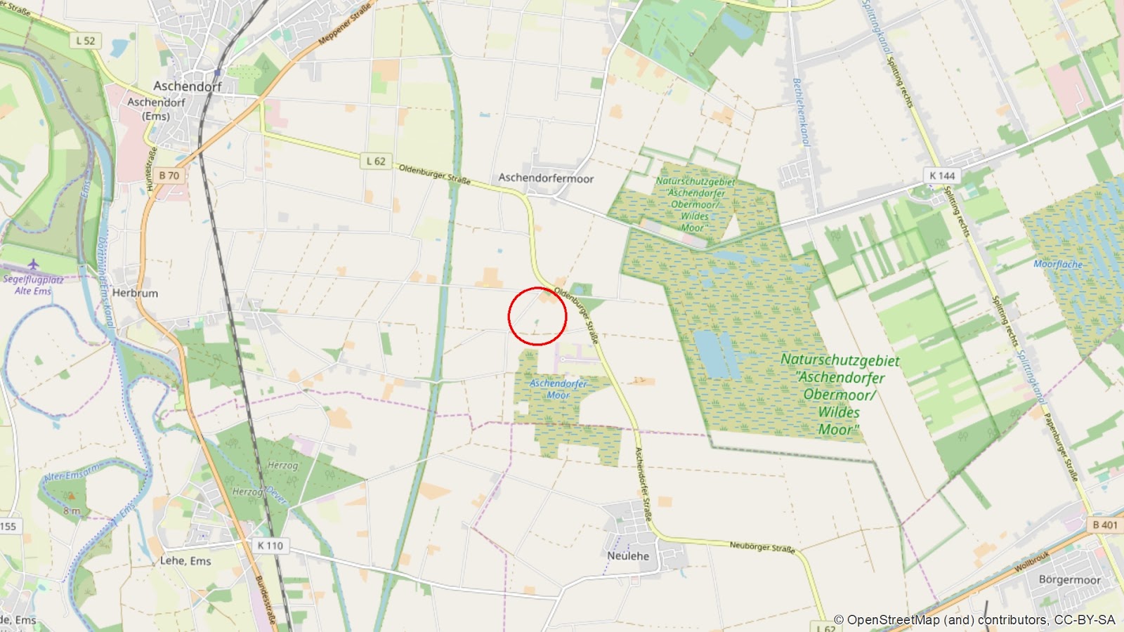 Das Lagerareal zwischen den Dörfern Aschendorfermoor und Neulehe in einer aktuellen Kartenansicht [Esri Basemap Openstreetmap].