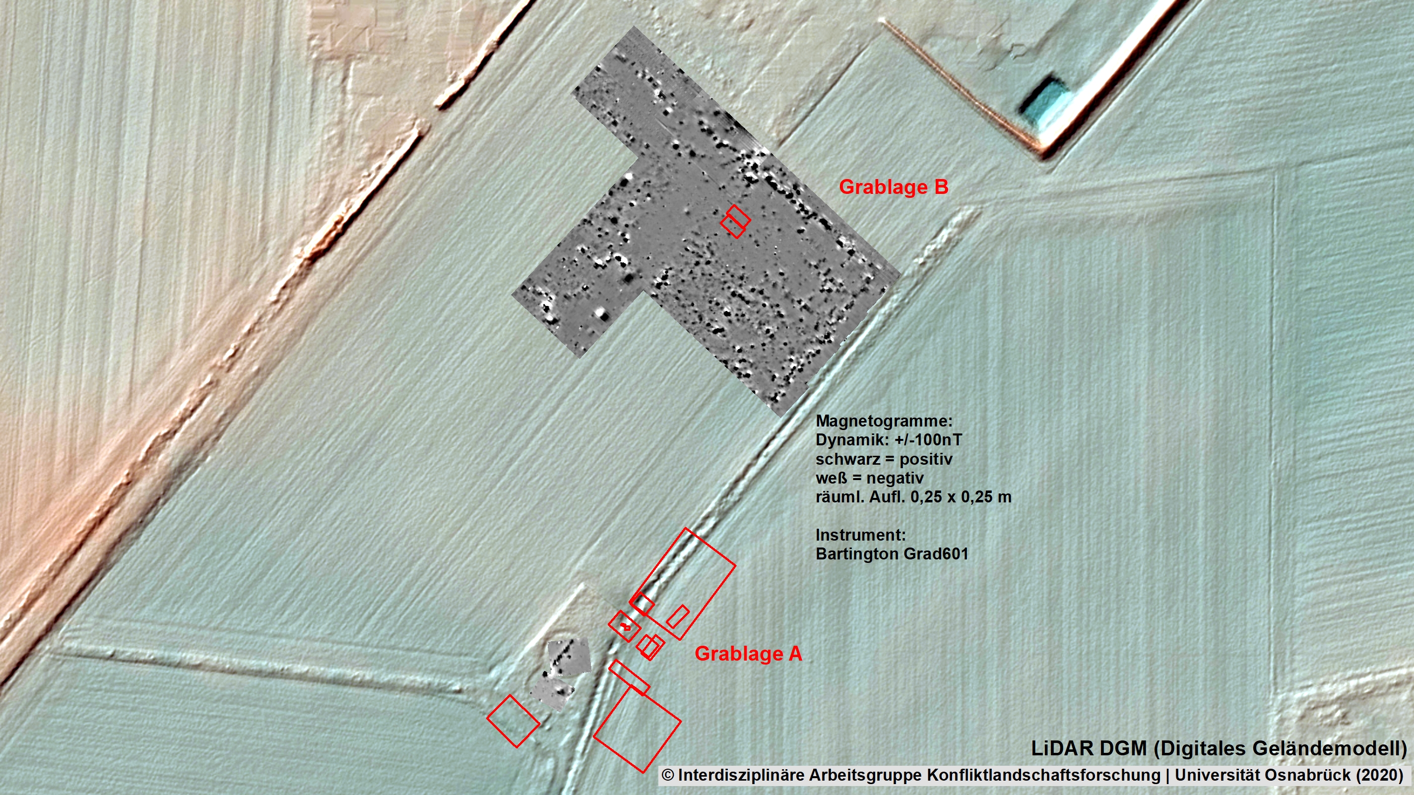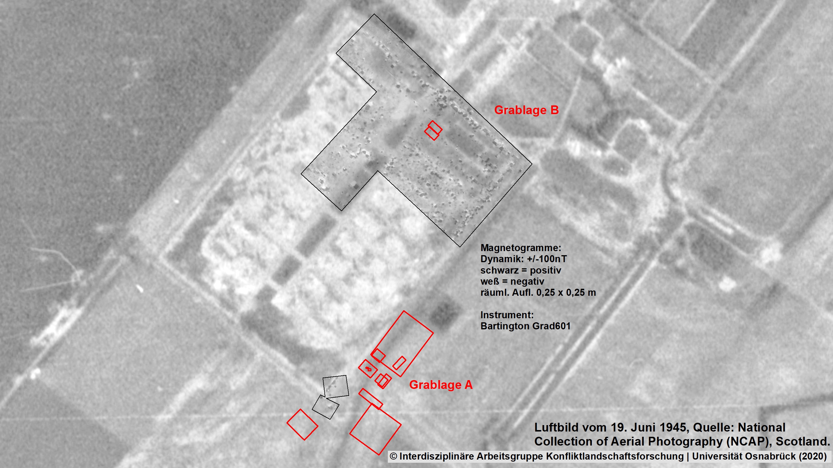 Allerdings ließ sich das auf mehreren Lagerplänen genau verzeichnete Massengrab (B) nicht eindeutig auf den Kartierungen der Magnetometerprospektion, den so genannten Magnetogrammen, nachweisen.