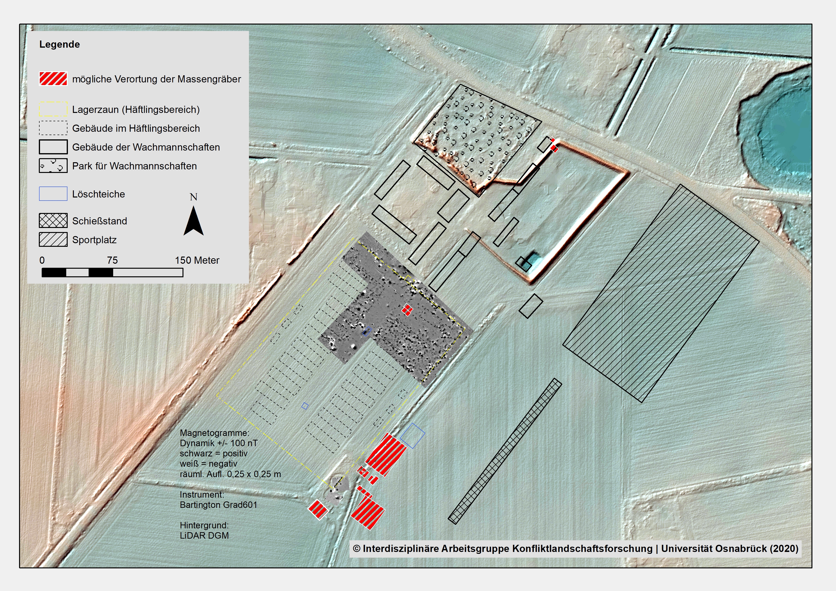 Im Rahmen einer geoarchäologischen Erkundung wäre nun zu klären, ob der Löschwasserteich bei der Beseitigung der Lagerreste mit Trümmermaterial verfüllt worden ist, das sich nun aufgrund seiner untypischen Beschaffenheit abzeichnet. Im Bereich der vermuteten Grablagen zeigt die Magnetometrie indes noch keine eindeutigen Hinweise auf eine Grube bzw. Grablage.